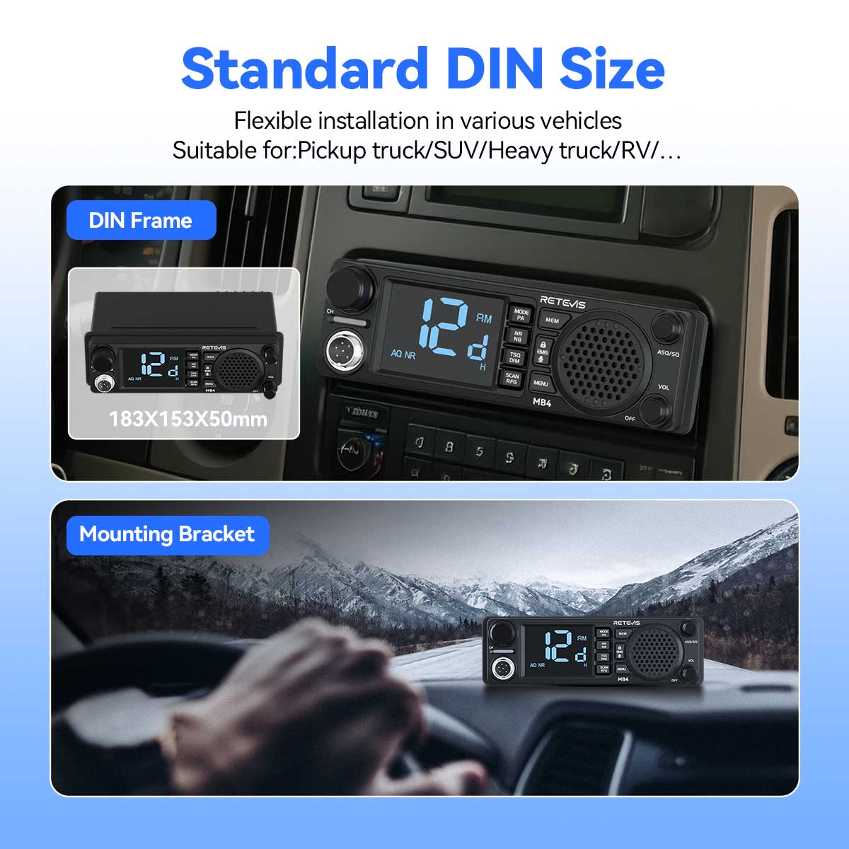 The Retevis MB4 is a professional-grade CB radio designed for the modern driver. Unlike traditional bulky CBs, the MB4 features a true DIN-Size form factor, allowing it to slide perfectly into a standard vehicle stereo slot for a clean, factory-installed look.
